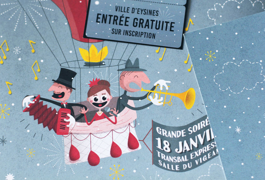 Campagne d'affichage, cartes de vœux, bannières pour réseaux sociaux et billets d'invitation pour une grande soirée de vœux avec bal début janvier.